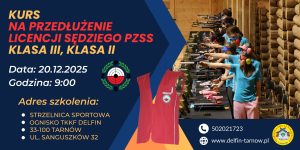 Informujemy, że w dniu 20 grudnia 2025 roku organizujemy szkolenie na przedłużenie licencji sędziowskich PZSS Klasy 3 i Klasy 2. Szkolenie rozpoczyna się o godzinie 9:00. Adres szkolenia: Strzelnica sportowa
